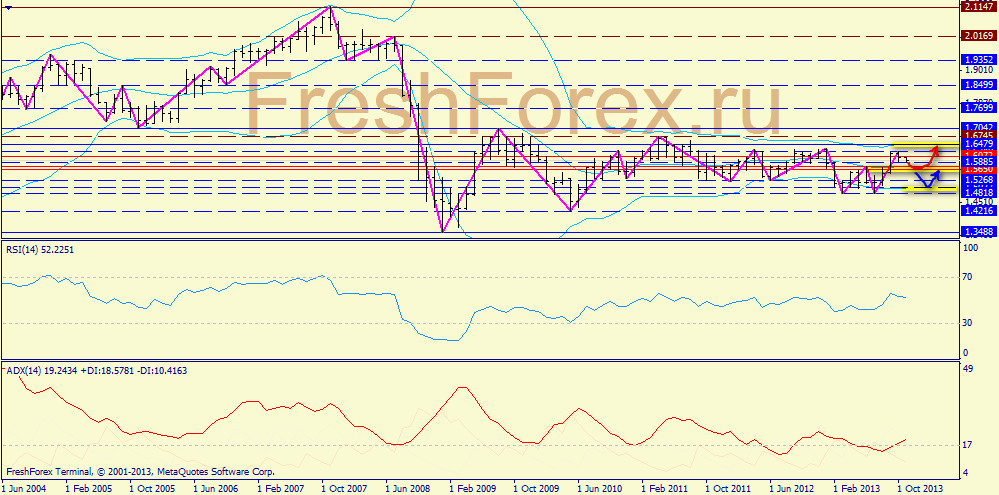 Недельный график: здесь видно, что существует почва и для более глубокого отката, к 1.5549 (средняя Боллинджера). Но опять же - ADX заряжен северно.