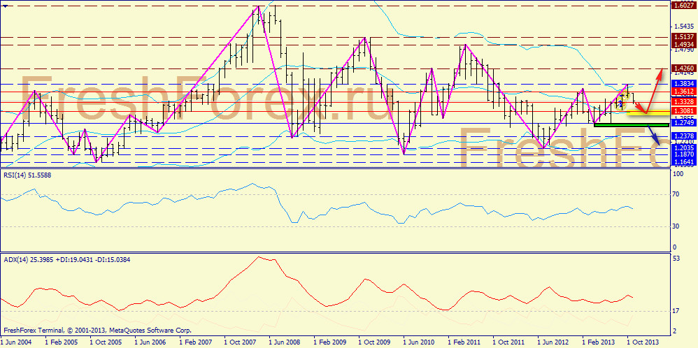 Недельный график: собственно, идентичный сценарий, но с более локализованной поддержкой (1.3264 - средняя Боллинджера). ADX пребывает в очень активной бычьей фазе, поэтому ниже чем 1.3264 евро мы можем и не увидеть.