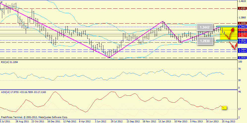 Недельный график: ADX активизируется, но быкам не хватает укомплектованного нисходящего свинга (нужен любой лоу ниже минимума последней недели 1.3205), поэтому вполне может случиться откат вниз. Прорыв же выше 1.3401, как мы отметили выше - почти приговор в виде дальнейшего роста к 1.3634.