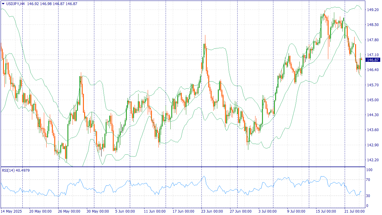 При сохранении умеренно‑рискового настроя и слабых внутренних драйверов в Японии (отложенные налоговые стимулы, стагнирующий реальный сектор) пара USDJPY, по‑видимому, продолжит подниматься к верхней границе июльского диапазона 148.50–149.00.