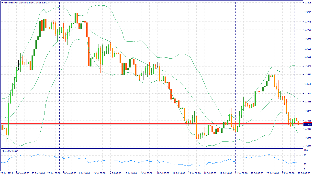 Фунт остаётся под давлением, скользя к 1,3410, поскольку рынок почти однозначно закладывает снижение ставки Банка Англии на заседании 7 августа. Ожидания смягчения усилены ростом безработицы до 4,7 % и замедлением зарплат до 5,0 %, что указывает на охлаждение рынка труда и повышает риск «жёсткой посадки» экономики.