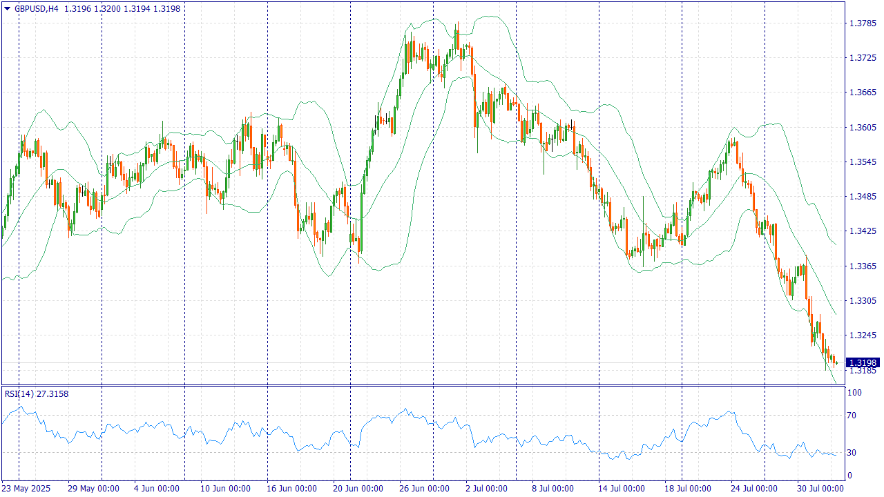 Фунт остаётся под давлением из-за укрепления доллара и ожиданий дальнейшего смягчения политики Банка Англии на заседании 7 августа. Риторика регулятора в июне—июле указывала на «постепенный и осторожный» курс снижения ставок на фоне слабого роста, а рынок закладывает вероятность очередного шага уже на ближайшей встрече. Ситуация осложняется тем, что июльская инфляция в Британии неожиданно ускорялась, но регулятор трактует её как временное последствие тарифных и ценовых шоков, не желая чрезмерно ужесточать финансовые условия.