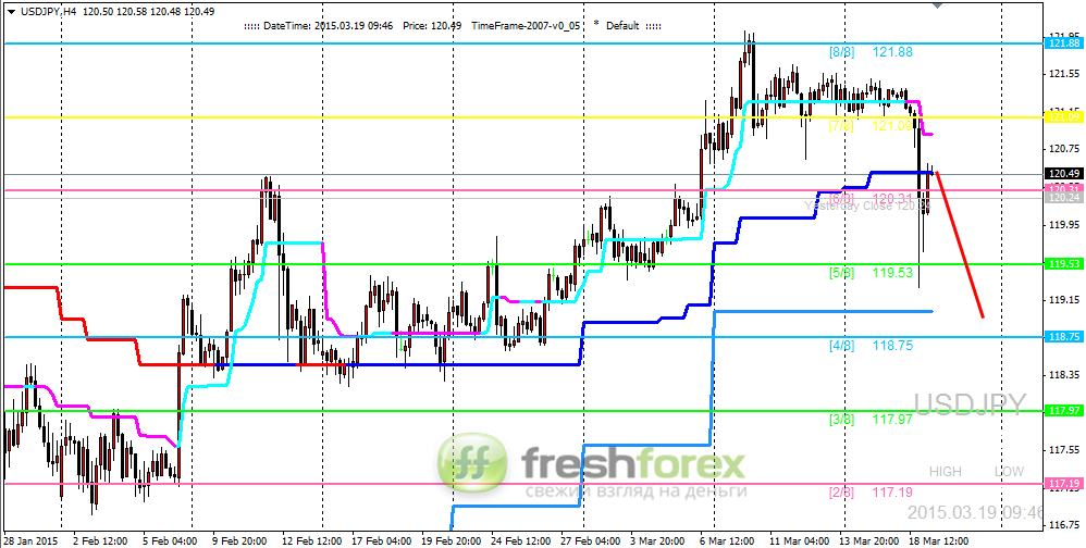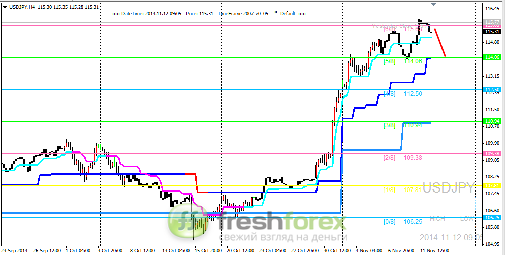 Четырехчасовой график USDJPY. Цель на уровне (+2/8) была достигнута. Как результат мы видим перерисовку уровней Мюррея. На текущий момент можем наблюдать неудачную попытку закрепиться выше отметки (6/8). Пока пара находится ниже данного уровня в качестве приоритетного стоит рассматривать вариант со снижением цены. Ближайшей целью выступает линия Дневного Супертренда.