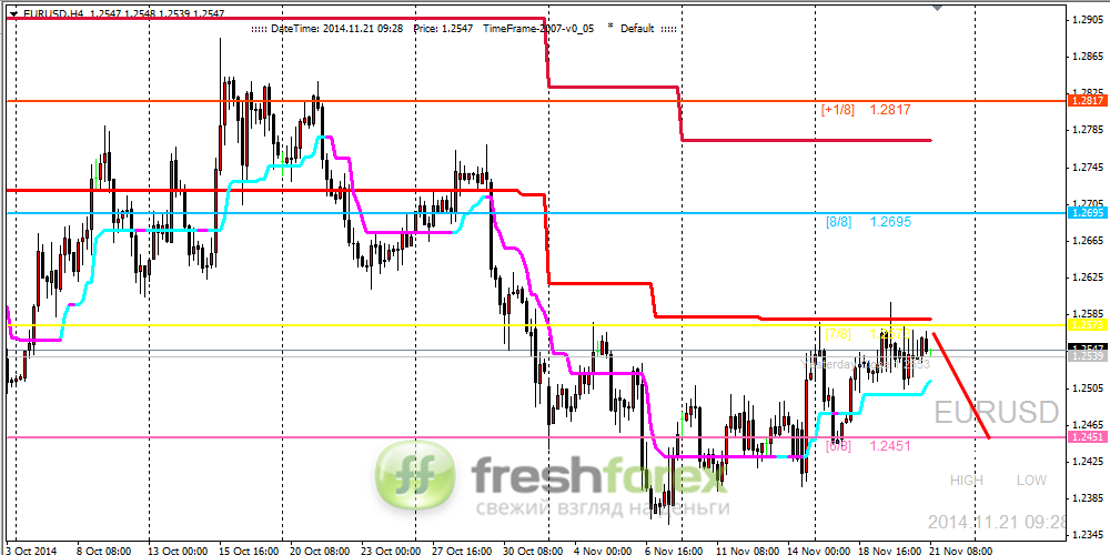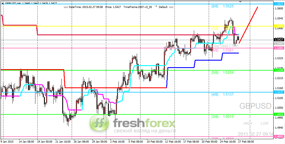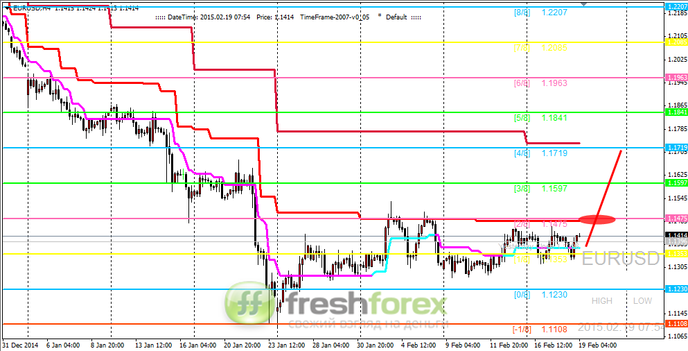 Четырехчасовой график EURUSD. Пара не дошла всего несколько пунктов до разворотного уровня (1/8). Тем не менее разворотный сигнал был отработан. От уровня (1/8) пара скорректировалась к главному уровню поддержки/сопротивления от которого цена достаточно быстро отскочила вниз. На текущий момент ближайшая поддержка находится на отметке (2/8). От нее можно ожидать возобновления восходящего движения. Альтернативный вариант, пробой уровня (2/8) сверху-вниз и снижение цены к главному уровню поддержки (0/8).