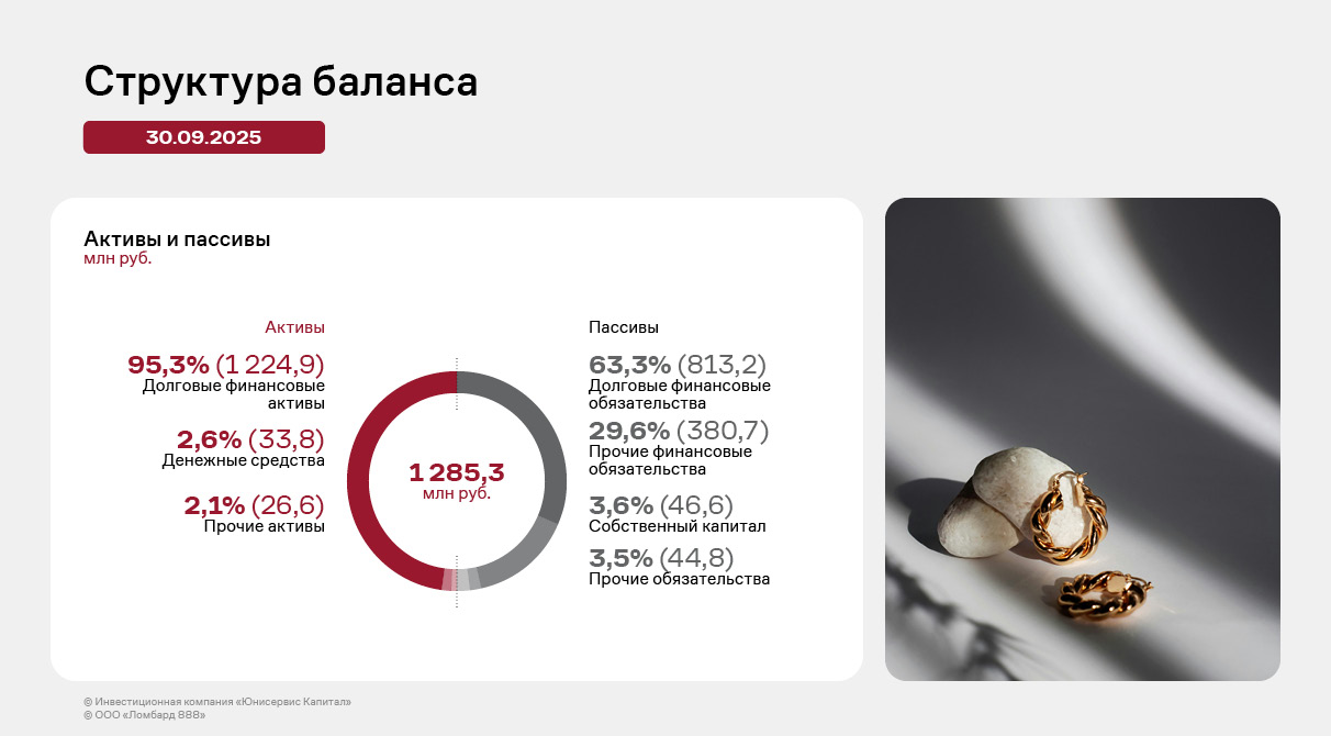 Напомним, что ООО «Ломбард 888» — быстрорастущая сеть финансовых офисов в 7 регионах России. Эмитент предоставляет займы под залог изделий из драгоценных камней и металлов, электронной и бытовой техники. Основная статья дохода компании — получение процентов по выданным займам. Получить заём клиенты могут в одном из 76 действующих на 30.09.2025 г. отделений ООО «Ломбард 888». Компания расширяет собственную сеть, открывая одиночные ломбарды и поглощая небольшие сети. При этом обязательства самого эмитента с учётом ограничений ЦБ РФ на фондирование для ломбардов на 100% состоят из беспроцентных займов бенефициарного владельца, а рост кредитного портфеля опережает темпы финансирования.