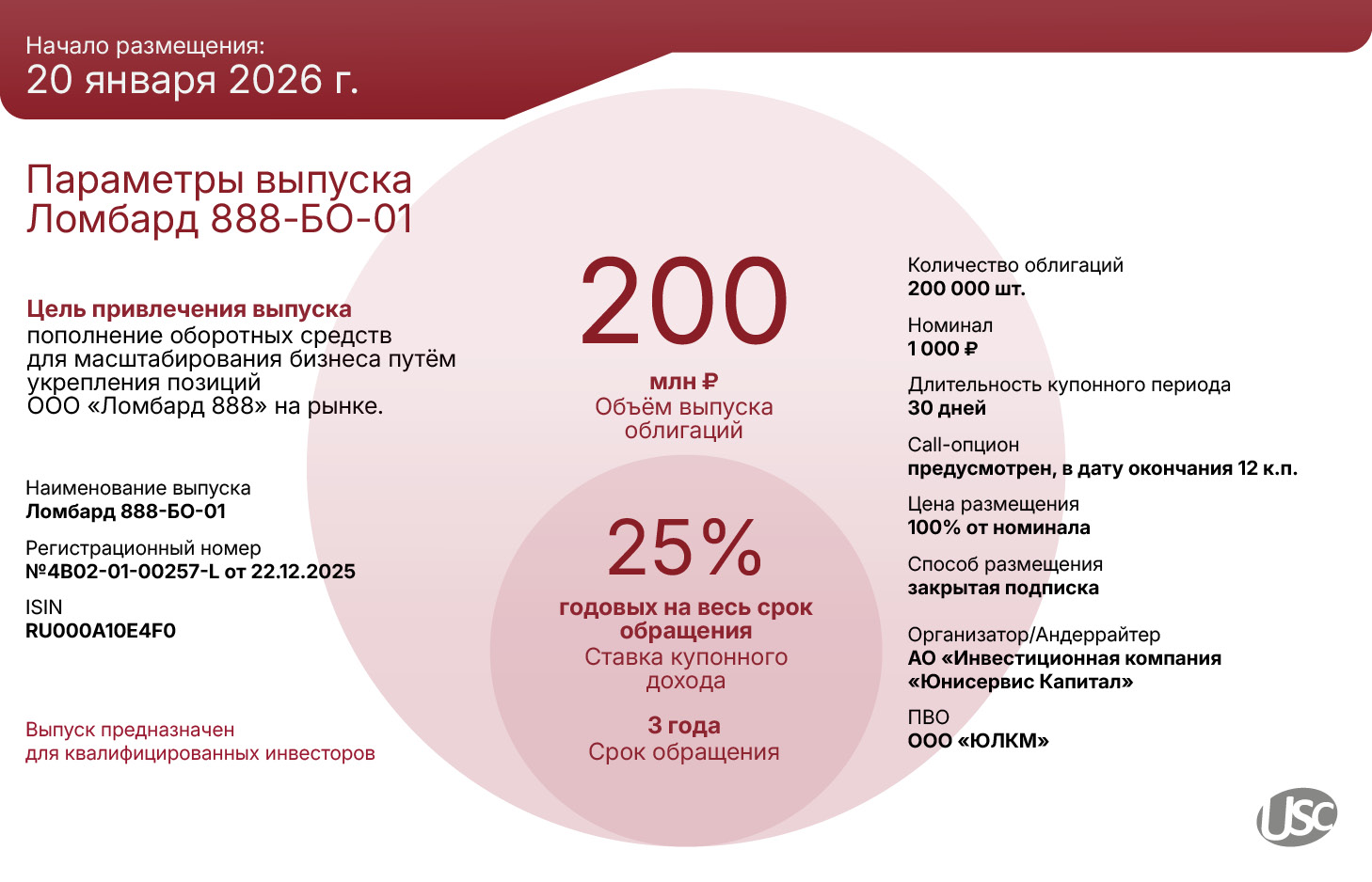 Размещение выпуска Ломбард 888-БО-01 (№ 4B02-01-00257-L от 22.12.2025) запланировано на январь 2026 года. Предварительно его объём составит 200 млн руб., номинал одной бумаги — 1 000 руб. Ориентир ставки купонного дохода — 25% годовых на весь срок обращения в 3 года. Выплата купонного дохода ежемесячная. Также эмитент намерен предусмотреть возможность проведения call-опциона в дату окончания 12 к.п.