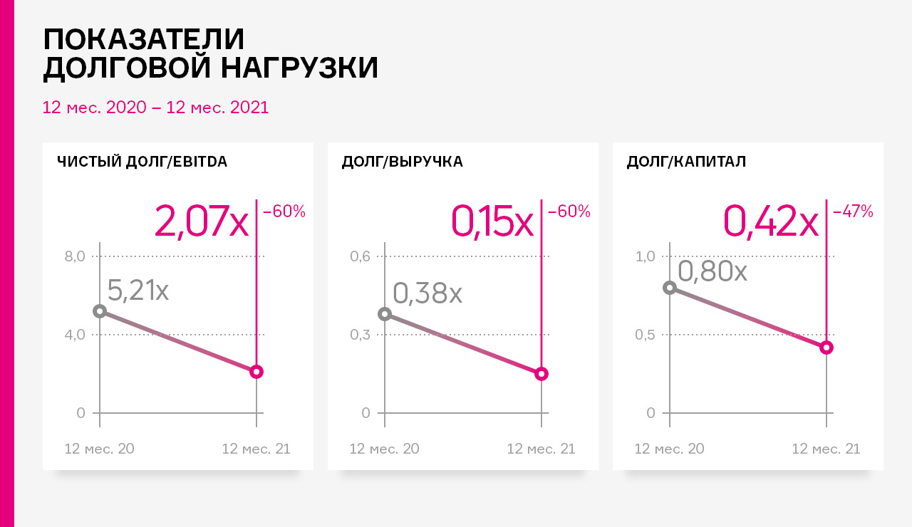 • долг/EBITDA 2,07х (против 5,21х за 2020 год).