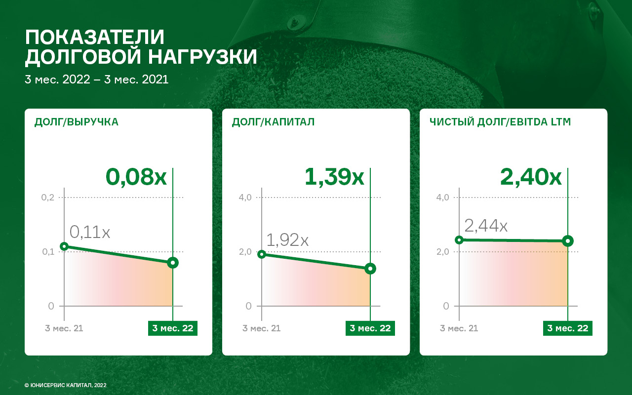Ощутимое снижение финансового долга на фоне роста показателя EBITDA LTM позитивно сказались на всех основных показателях долговой нагрузки: соотношение чистого финансового долга к EBITDA LTM на уровне 1,79х и долговых обязательств к выручке — 0,12х находятся на своих исторических минимумах, что говорит об устойчивости эмитента в части обслуживания своих долговых обязательств.