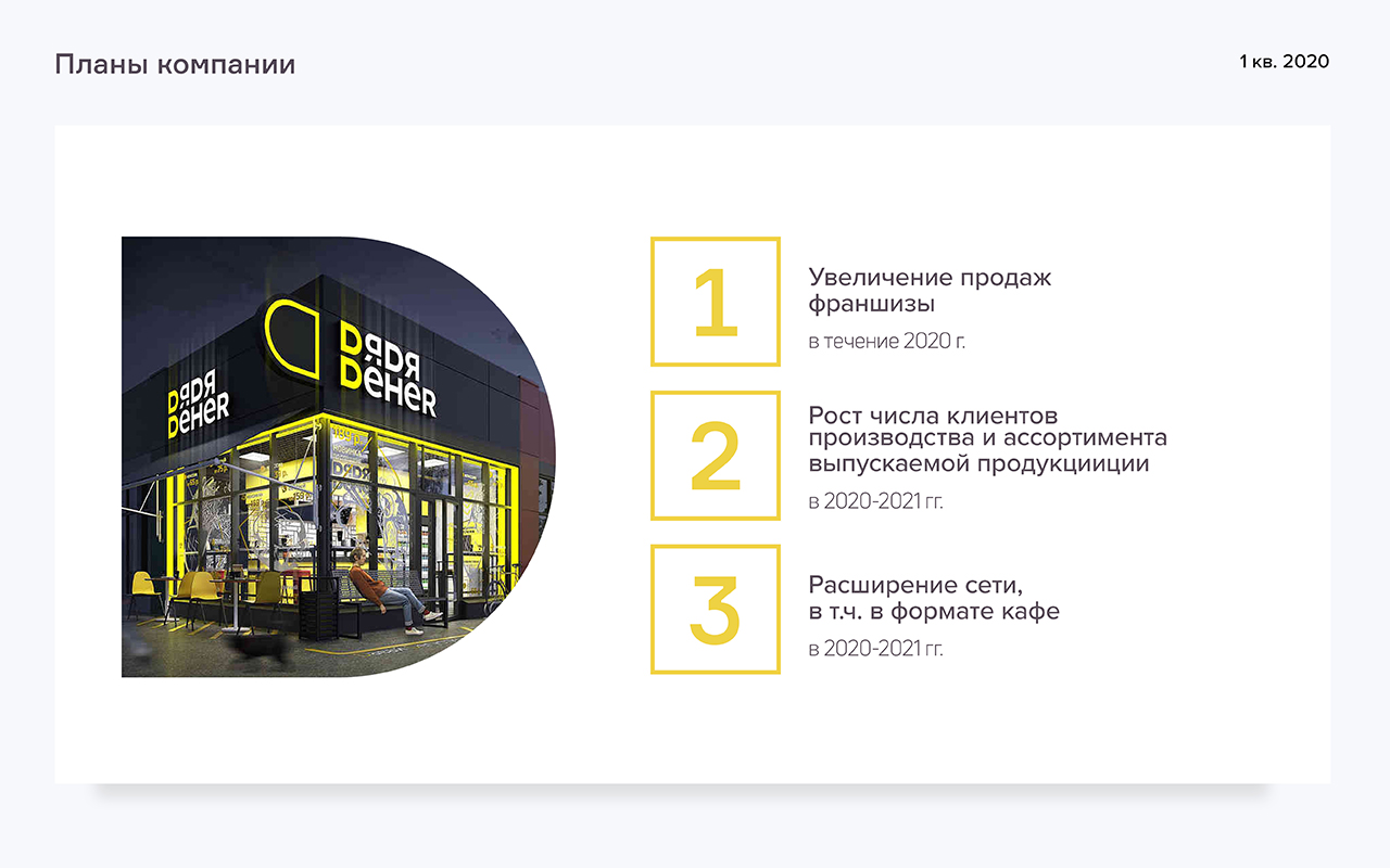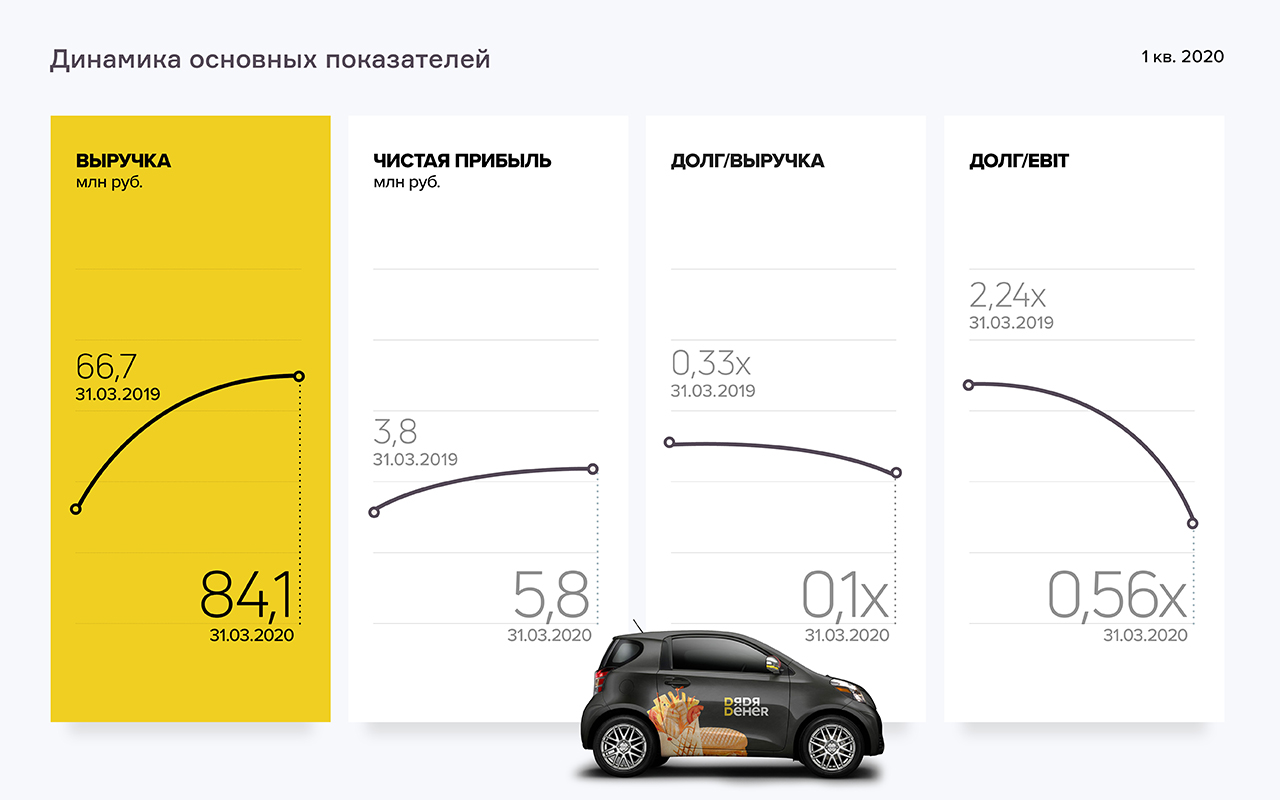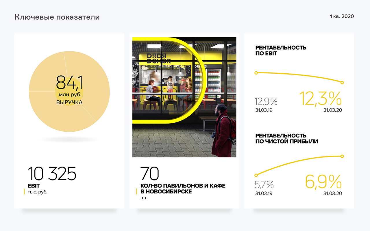 В первом квартале 2020 года наблюдается рост выручки и рентабельности по чистой прибыли ООО «Дядя Дёнер» при снижении рентабельности по консолидированной прибыли группы, в которую помимо вышеупомянутой компании входят ООО «Бердск ДД», управляющее сетью в Новосибирской области, ООО «Теон» (Кузбасс) и ООО «ДД Фэктори» (производство в Новосибирске).