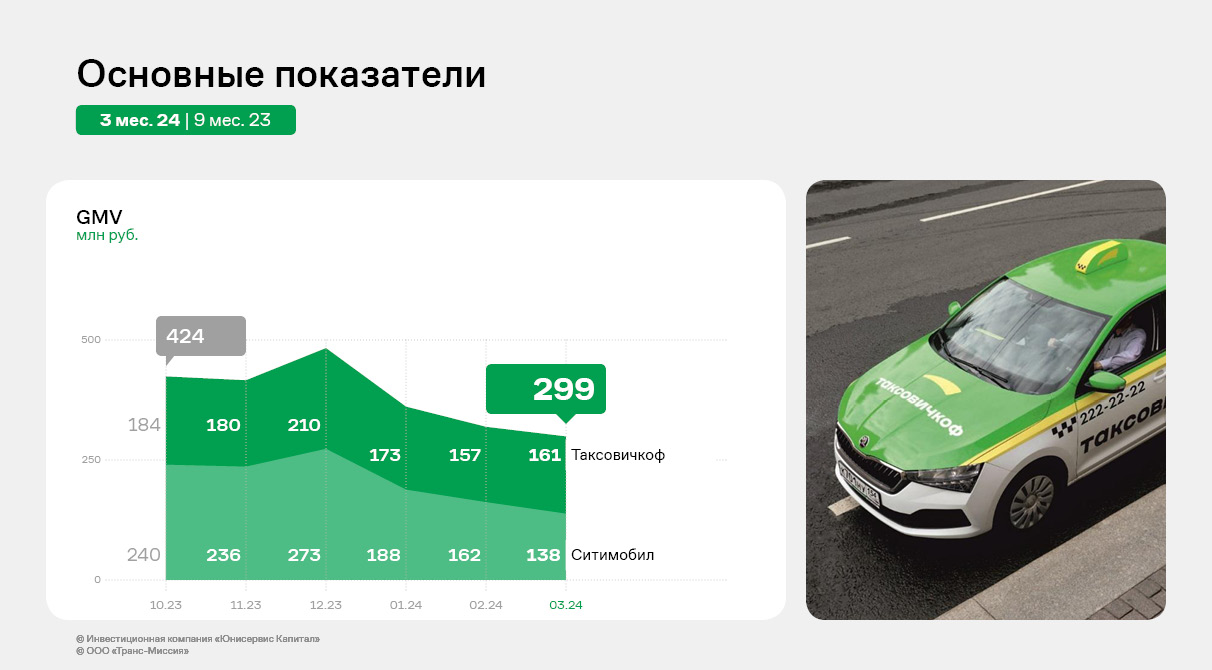 Общий оборот сервисов (GMV) «Таксовичкоф» и «Ситимобил» составил 6 637 млн руб., что на 18,3% меньше показателя прошлого года. Это связано с сокращением количества выполненных заказов на 31,1% к АППГ, это является следствием трех факторов: начала СВО, перехода на новое ПО и вступления в силу закона о такси, что вызвало временный отток водителей.