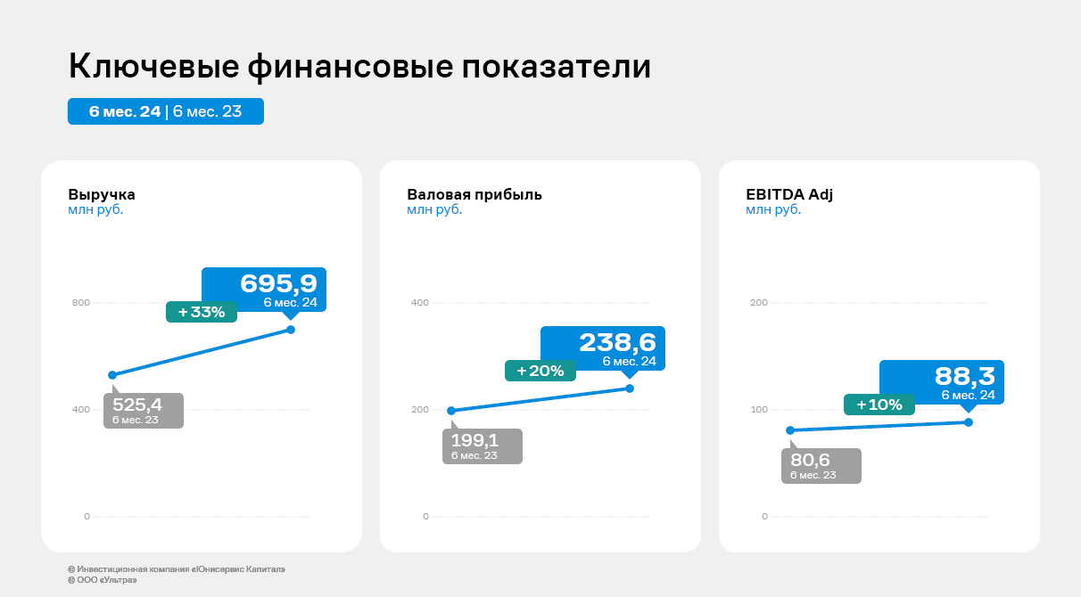 Рост выручки в 1 полугодии 2024 г. составил 32,5% в сравнении с аналогичным периодом прошлого года на фоне увеличения цен и количества продаж в штуках. Валовая прибыль составила 238,6 млн руб., прибавив 19,8% к АППГ. Показатель EBITDA adj также демонстрирует положительную динамику, в отчетном периоде он зафиксирован на уровне 88,3 млн руб.