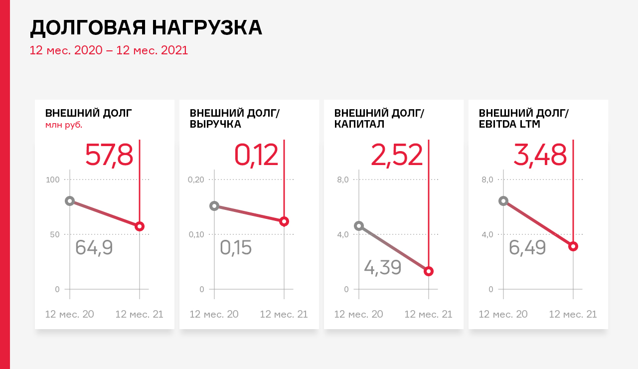 Долговая нагрузка компании по-прежнему состоит из внешнего долга и долга перед собственником. На конец отчетного периода общая сумма задолженности составила 223 716 тыс. руб., увеличившись за счет внешнего финансирования по сравнению с аналогичным периодом прошлого года на 7,3%. Как следствие, коэффициент «Внешний долг/Выручка LTM» увеличился с 0,13 до 0,17. Однако показатели «Чистый внешний долг/ EBITDA LTM» и «Внешний долг/Собственный капитал» снизились на 20,5% и 9,9% соответственно. Это свидетельствует о снижении долговой нагрузки и об увеличившейся способности организации погасить имеющиеся обязательства.