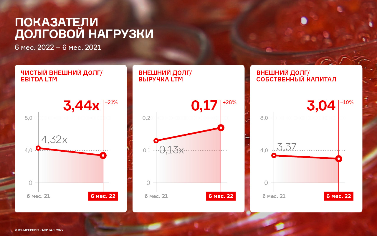 По итогам второго квартала 2022 года эмитент отмечает разнонаправленную динамику операционных показателей. Суммы чистой прибыли и EBITDA LTM увеличились в сравнении с аналогичным периодом 2021 года на 78% и 66%. При этом, значения выручки и валовой прибыли оказались ниже сравнительных данных на 12% и 7%.