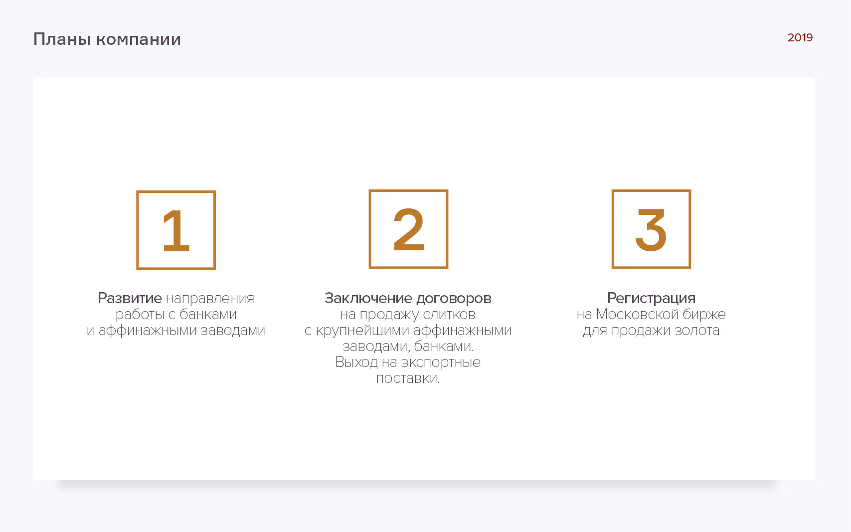 Дальнейшее развитие бизнеса компании будет реализовываться путем увеличения объемов поставок золота банкам, его реализации через ММВБ, организации экспорта.