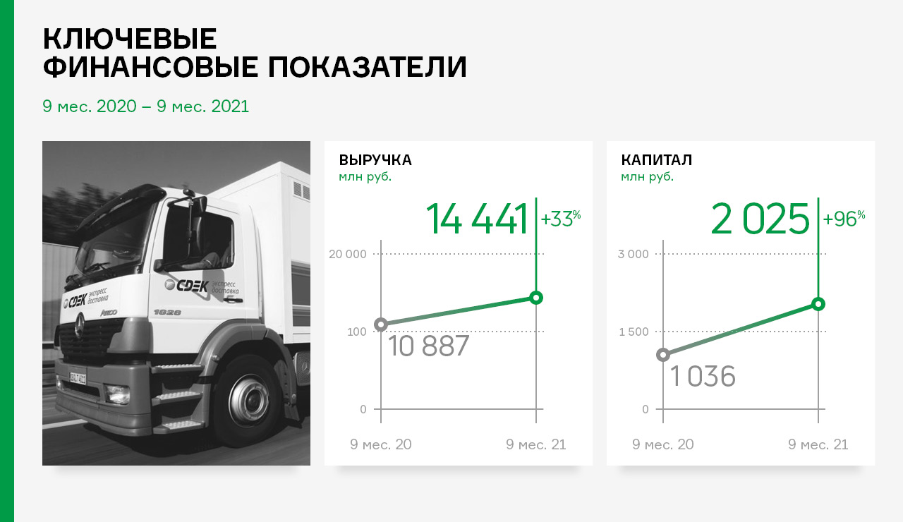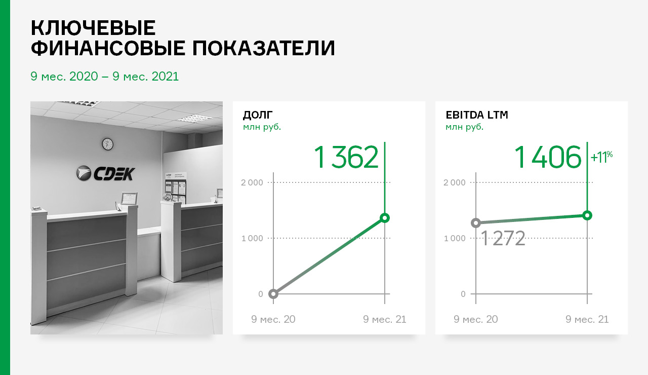 Одним из ключевых драйверов роста выручки является рост количества активных клиентов. По итогам 9 мес. 2021 клиентская база ООО «СДЭК-Глобал» и сети франчайзи превысила 2 миллиона.
