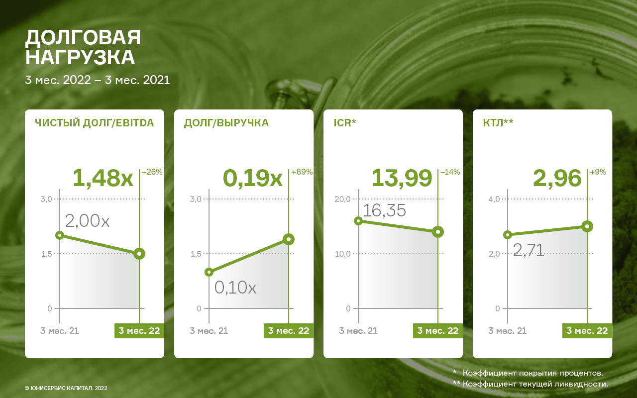 Значения показателей рентабельности в 1 кв. 2022 года существенно превосходят данные за аналогичный период прошлого года. Стоит отметить, что во втором квартале эмитент ожидает небольшое снижения рентабельности бизнеса в связи с ожидаемыми отрицательными курсовыми разницами, вызванными ростом курса рубля к доллару.