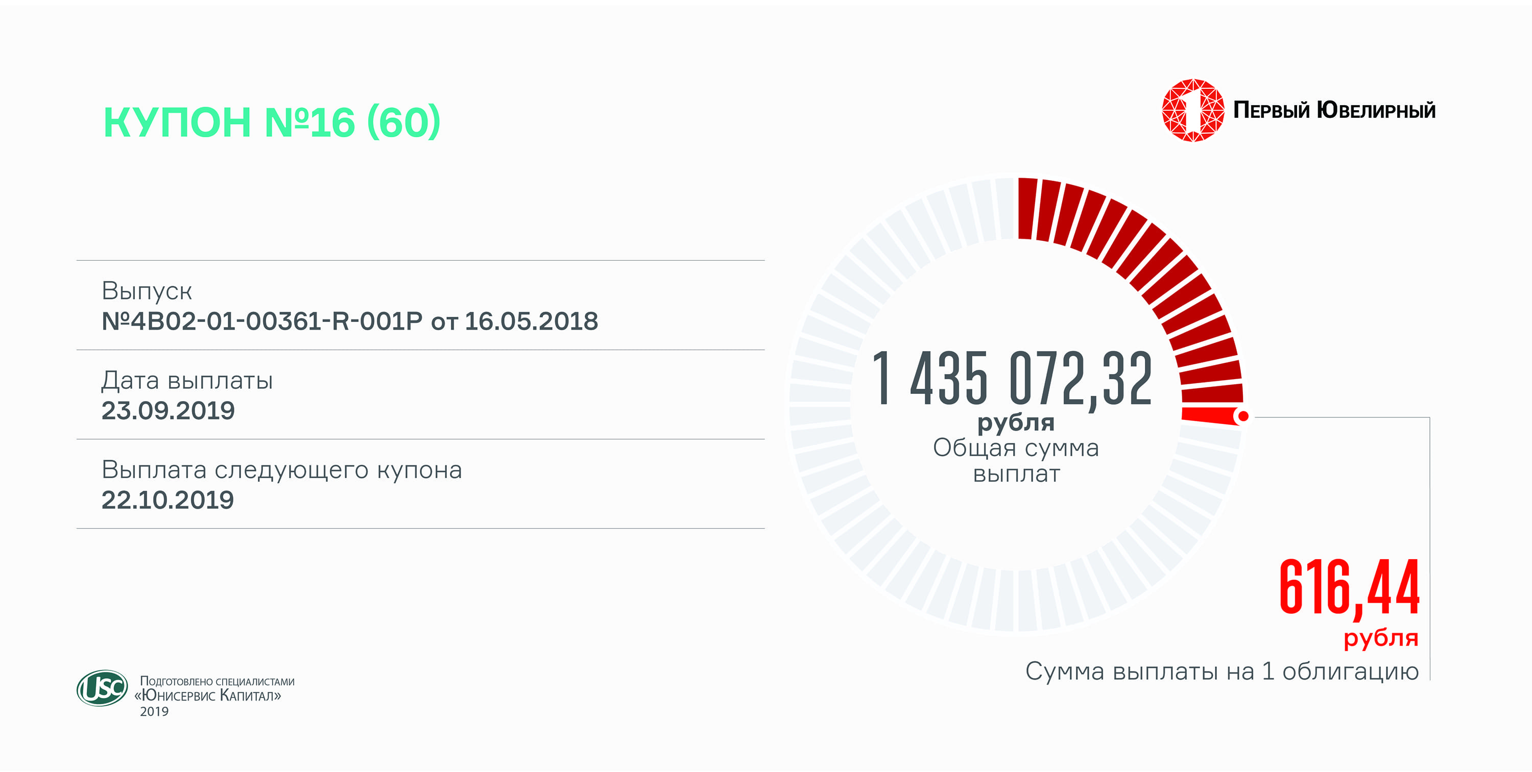На одну облигацию начисляется по 616,44 рубля. Всего в обращении находится 2328 ценных бумаг «Первого ювелирного» (RU000A0ZZ8A2). Согласно условиям выпуска, купонный доход выплачивается ежемесячно, ставка на второй год обращения — 15% годовых, номинал облигации составляет 50 тыс. рублей.