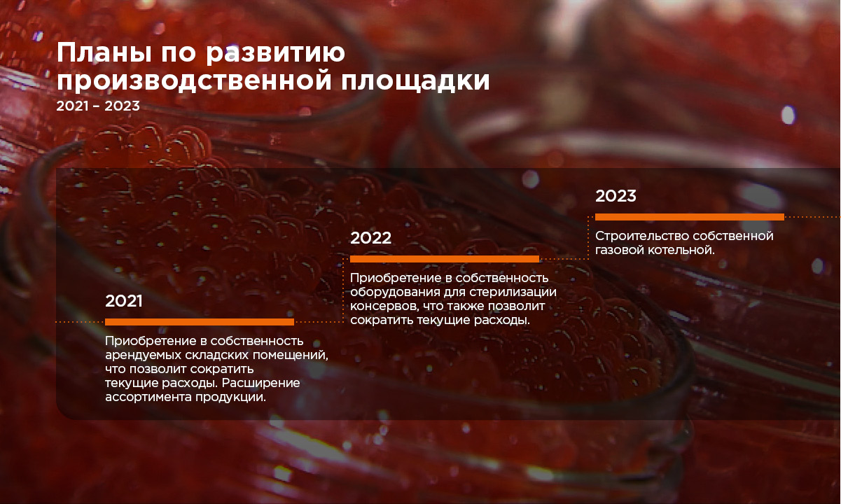 Компания осуществляет деятельность на собственной производственной площадке, оснащенной автоматизированными линиями консервации и фасовки продукции. В ассортименте 3 основных товарных категории продукции — икра лососевых, рыбные консервы и паштеты — представленные широкими линейками. В 2021 году компания планирует запустить новинку — консервы из мяса птицы. Руководство компании ожидает, что продукт будет пользоваться популярностью у покупателей и повлияет на рост выручки. О финансовом же положении компании по итогам 2020 г. более подробно.