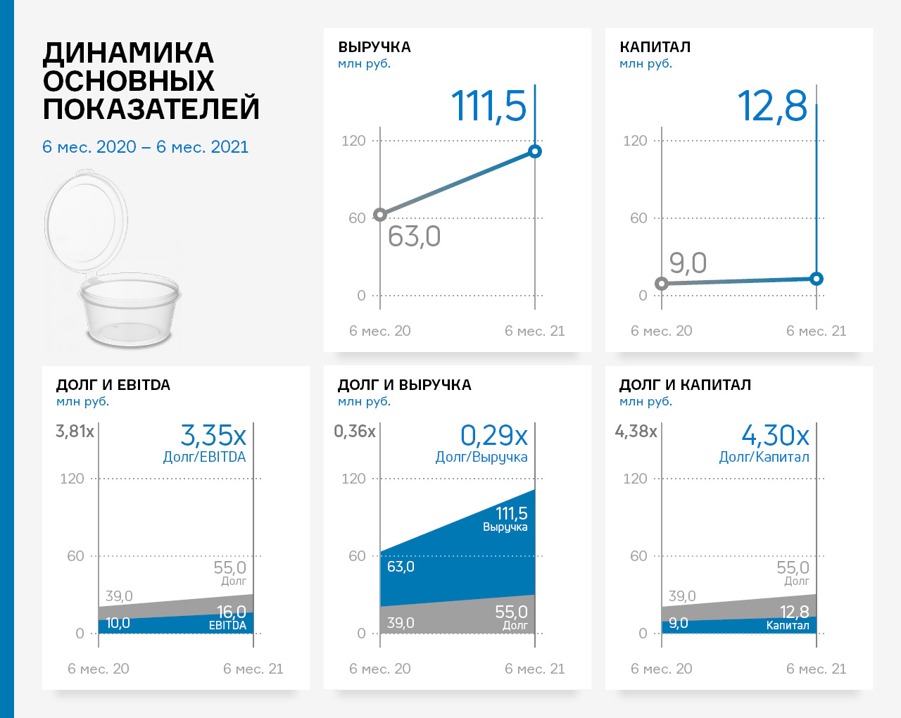 По состоянию на 30.06.2021 года финансовые показатели компании существенно лучше значений того же периода 2020 года: валовая прибыль выросла в 2,7 раза и составила 44,6 млн рублей, показатель EBIT увеличился с 4,3 млн рублей до 6,1 млн рублей, прирост составил 1,8 млн рублей (+41,9%), чистая прибыль компании увеличилась на 64,5% и составила 2,2 млн рублей.