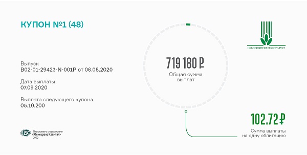 Общая сумма купона, перечисленная компанией в НРД — 1 380 840 рублей (115,07 за одну бумагу). По условиям эмиссии серии БО-П02 (ISIN код: RU000A1020K7), срок обращения облигаций составляет 5 лет или 60 купонных периодов продолжительностью 30 дней. Однако инвесторы имеют право предъявить бонды к досрочному выкупу во время плановых оферт, ближайшая из которых назначена на август 2022 г.