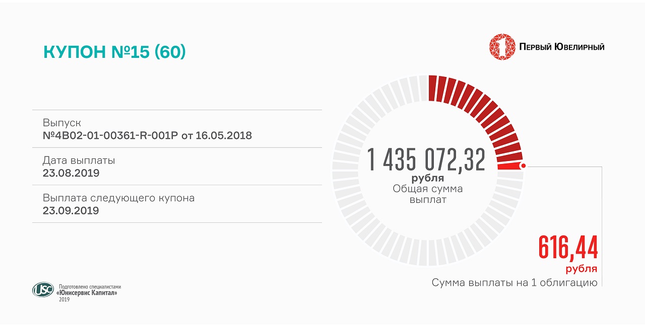 Размещение биржевых облигаций «Первого ювелирного» стартовало год назад. Компания привлекала инвестиции по мере потребности в финансировании оборотного капитала и остановилась на сумме 116,4 млн рублей. Всего в обращении находится 2328 пятилетних облигаций. Номинал ценной бумаги — 50 тыс. руб. Ставка составляет 15% годовых. Выплата купонного дохода осуществляется каждые 30 дней. Погашение выпуска назначено на 2023 год.