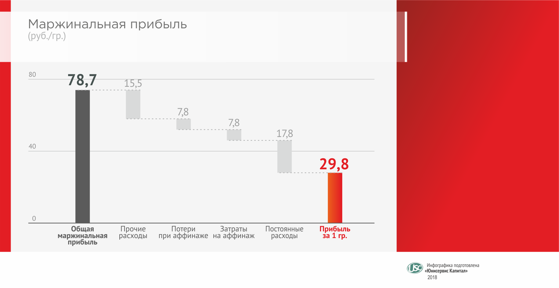 При таком обороте «Первый ювелирный» получает 78,7 руб. маржинальной прибыли с одного грамма. А затраты составляют 48,9 руб./гр. и включают расходы на аффинаж – 7,8 руб., потери при аффинаже – 7,8 руб., постоянные расходы, большую часть которых занимают ФОТ и аренда – 17,8 руб., а также прочие расходы, преимущественно налоги и банковские комиссии, в размере 15,5 руб. Разница с доходами составляет 29,8 руб. – такую прибыль получает трейдер за 1 грамм металла в месяц.
