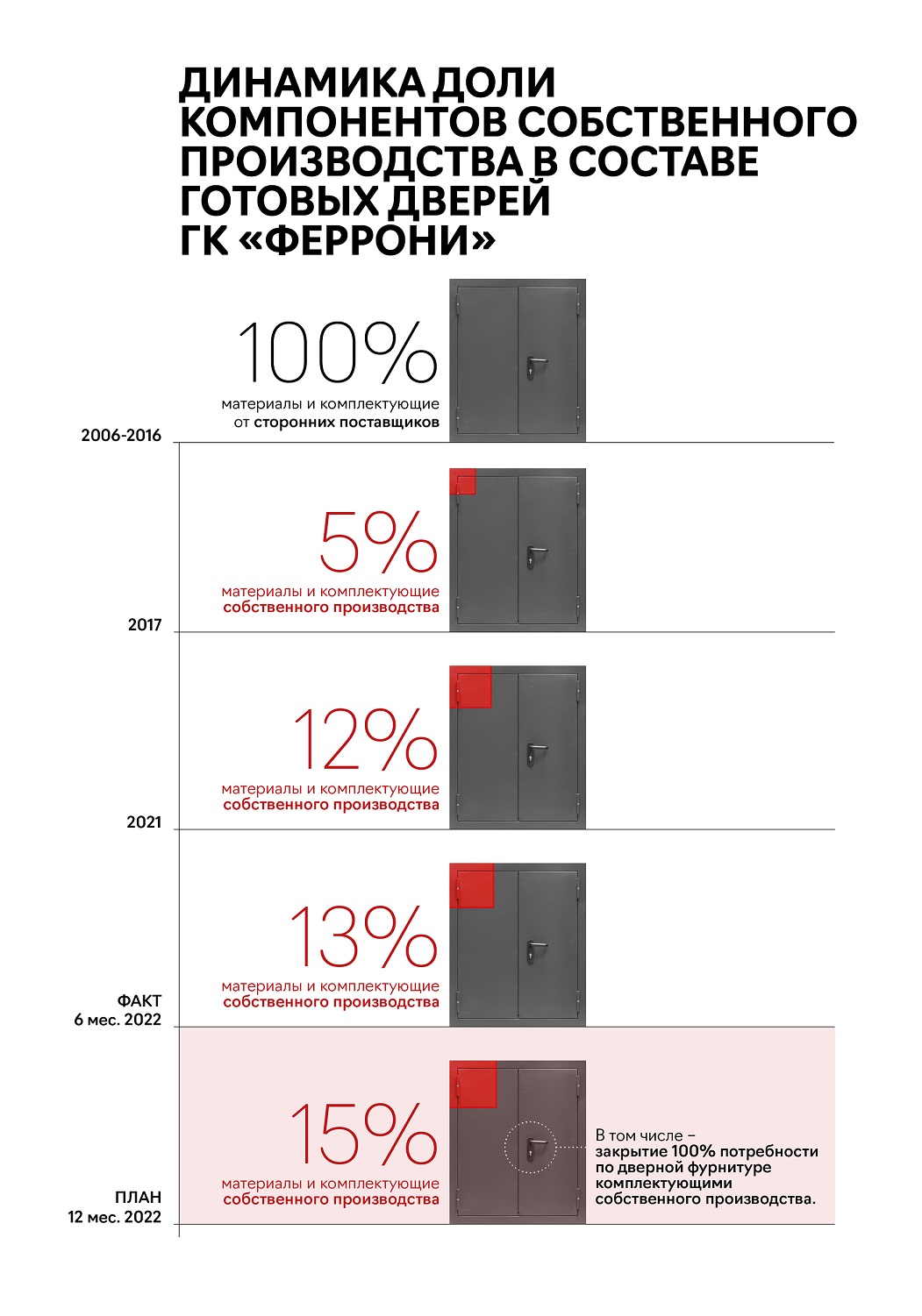 В марте компания поставила перед собой задачу по углублению импортозамещения и направила все силы на ее реализацию. Помимо увеличения доли собственного производства дверей, к октябрю текущего года вся необходимая фурнитура будет производиться собственными силами эмитента.