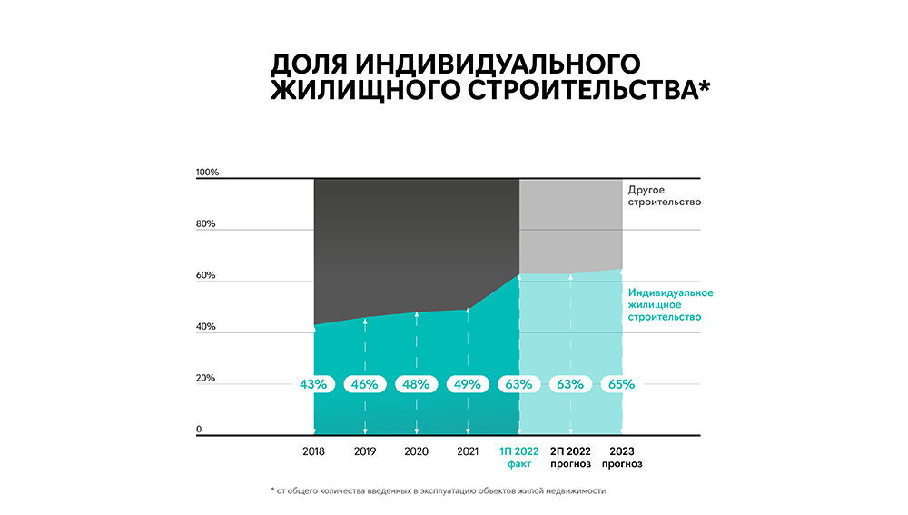 1. Доля ввода объектов индивидуального жилищного строительства в объеме новостроек достигла рекордных показателей — 63% по итогам первого полугодия 2022 г. В перспективе двух лет прогнозируется сохранение такого уровня и увеличение его до 65%.