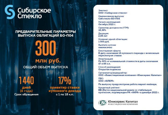 Известны предварительные параметры выпуска серии Сибстекло БО-П04 (№ 4B02-04-00373-R-001P от 13.10.2023): объем — 300 млн руб., номинал одной облигации — 1 000 руб., ориентир ставки купонного дохода — 17% годовых с 1 по 18 купонные периоды, далее предусмотрена безотзывная оферта. Ориентир доходности (YTM) — 18,39%. Дюрация — 2,88 лет. Срок обращения составит 1 440 дней, а купонный период 30 дней. Также эмитент планирует предусмотреть возможность досрочного погашения по 50% от номинальной стоимости в даты окончания 47 и 48 к. п.