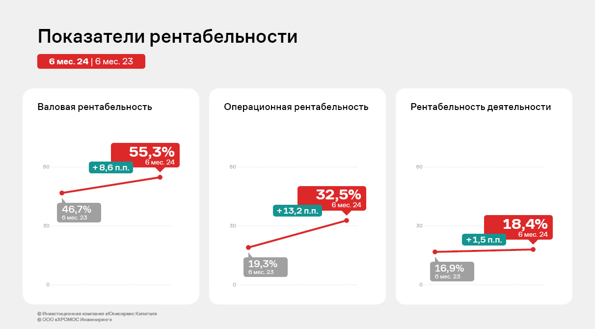 Все показатели рентабельности ООО «ХРОМОС Инжиниринг» продолжают оставаться на высоком уровне. Достичь этого удалось благодаря существенному расширению и диверсификации клиентского портфеля. Также благодаря наличию собственной производственной площадки и учебного центра, эмитент продолжает оптимизировать затраты.