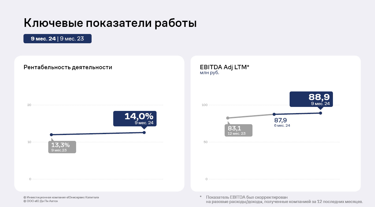 Тем не менее, за 9 месяцев 2024 года компания достигла выручки на уровне 162 млн руб., что выше аналогичного показателя прошлого года почти на треть. Эффективная деятельность работы за 9 месяцев 2024 года отразилась и на скорректированном показателе Adj EBITDA LTM, который достиг 88,9 млн руб. — это на 7% выше показателя 12 месяцев 2023 года.