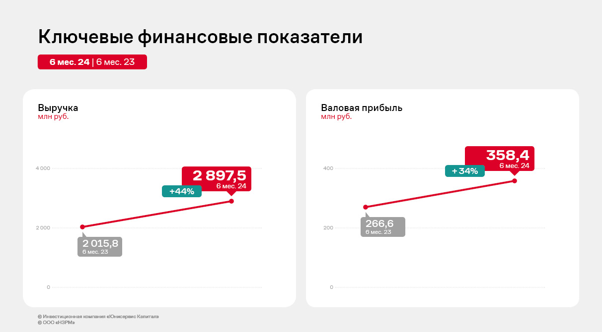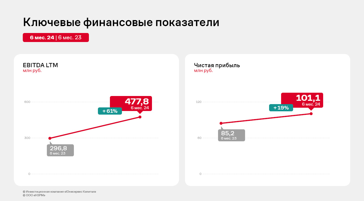 За 6 месяцев 2024 года эмитент продемонстрировал рост ключевых финансовых показателей. Выручка увеличилась на 43,7%, валовая и чистая прибыли на 34,4% и 18,7%, EBITDA LTM на 61%.