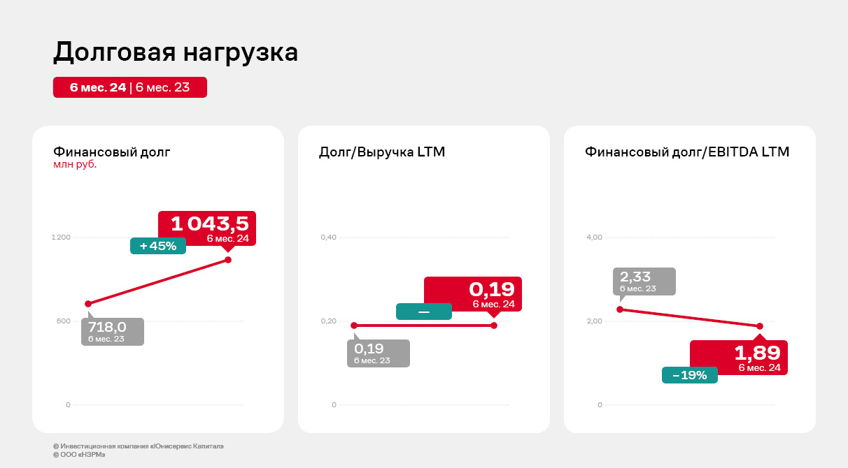 Основным источником финансирования деятельности эмитента остаются заемные средства. Финансовый долг на 30.06.2024 г. составил 1 043,5 млн рублей, увеличившись по сравнению с уровнем прошлого года на 45,3%. При этом за счет положительной динамики ключевых операционных показателей долговые коэффициенты сохраняют комфортный уровень и имеют существенный запас прочности.