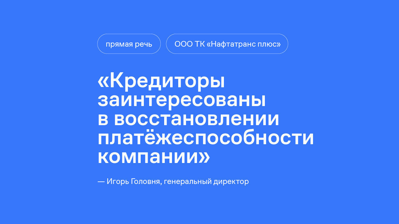 Банкротство — крайняя и никому не выгодная мера, к которой имеет смысл обращаться, когда все возможности урегулирования уже исчерпаны. В нашем случае, такие возможности есть, и именно их мы сейчас активно прорабатываем. Компания не планирует заявлять о собственном банкротстве, но пока идут переговоры, не исключено, что иски о признании «Нафтатранс плюс» банкротом могут подавать кредиторы, с которыми ещё не достигнуты позитивные договорённости. Пока таких прецедентов нет. И мы предпринимаем всё, что в наших силах, чтобы не было и впредь.