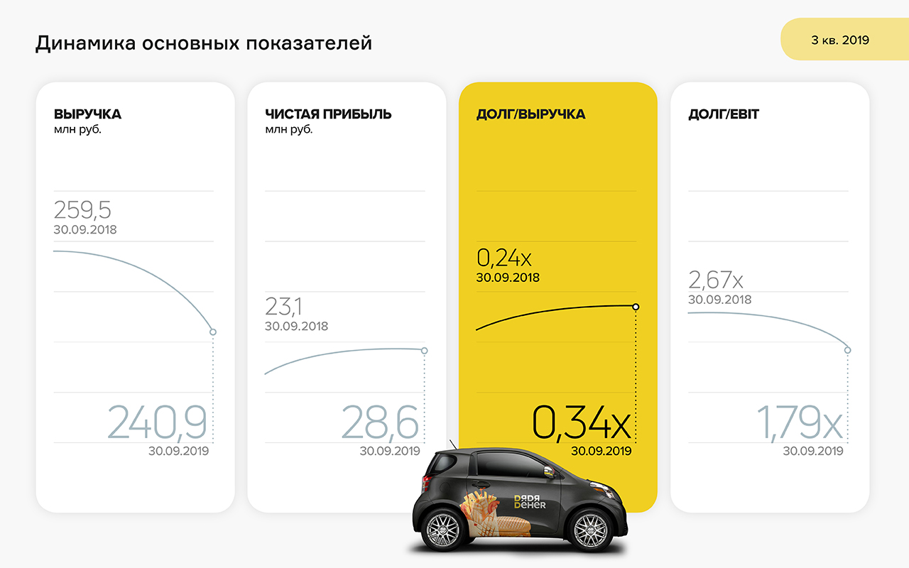Средний ежедневный объем торгов облигациями ООО «Дядя Денер» составляет около полумиллиона рублей. Средневзвешенная цена за 1-3 кварталы 2019 г. — 101,72% от номинала.