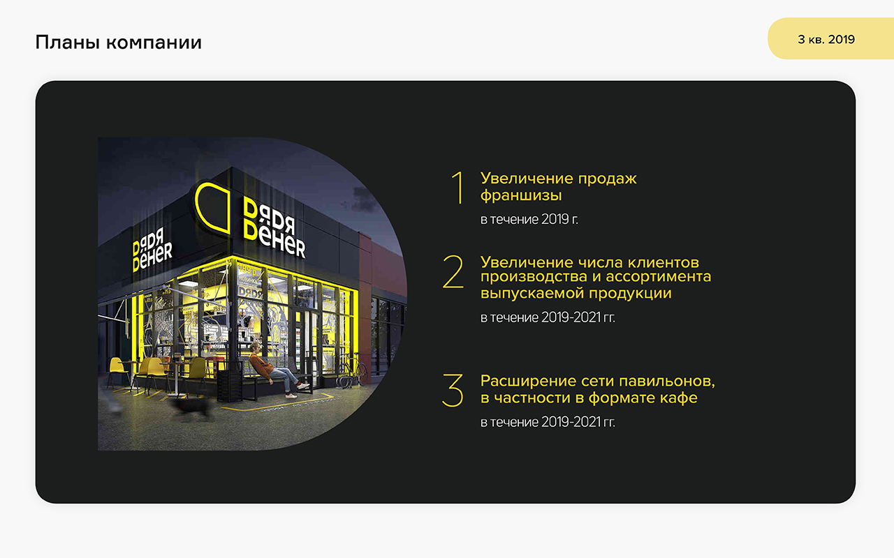 В 2019 году открылось новое кафе «Дядя Дёнер» в пос. Краснообск Новосибирской области, которое оказалось достаточно успешным и принесло компании за 6 месяцев 3,8 млн рублей выручки и 193,4 тыс. рублей чистой прибыли. Всего выручка по всем кафе выросла на 11,8%, операционная прибыль — на 5%.