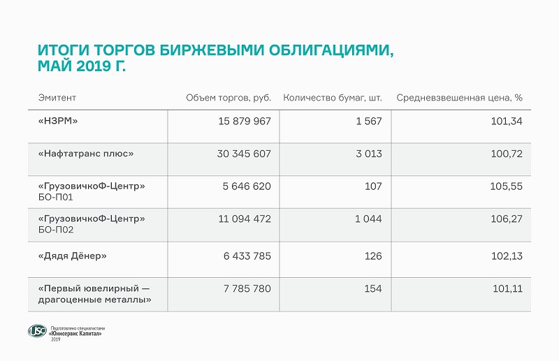 В мае объем вторичных торгов облигациями «ПЮДМ» составил 7% от объема выпуска, первого выпуска «ГрузовичкоФ» и «Дядя Дёнер» — по 11%, «НЗРМ» — 20%, «Нафтатранс плюс» — 25%, второго выпуска «ГрузовичкоФ» — 27%.