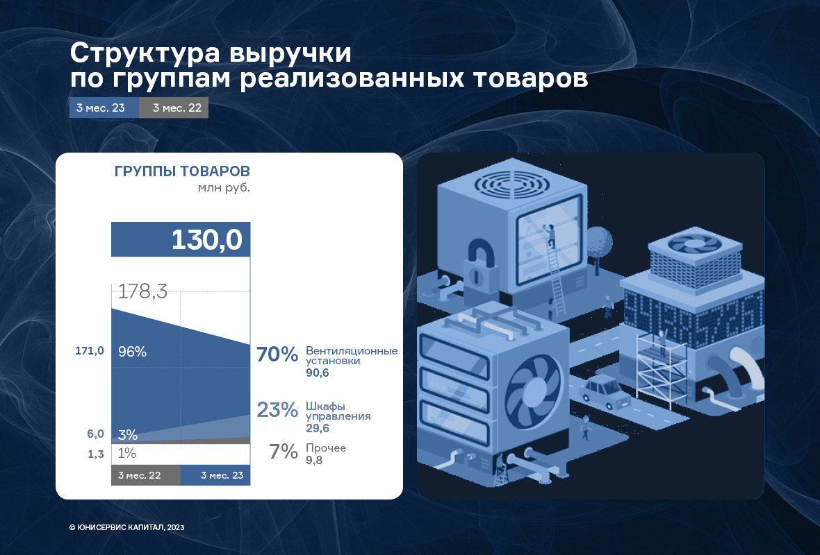 Выручка компании за 6 месяцев 2023 г. составила 502,6 млн руб., увеличившись на 63% к АППГ. Аналогичная ситуация наблюдается и по всем показателям прибыли. Такого существенного роста удалось достичь за счет наращивания клиентского портфеля и его диверсификации, и объемов реализованной продукции, соответственно: в отчетном периоде эмитенту удалось реализовать 1 142 единицы продукции (вентиляционные установки, шкафы управления, смесительные узлы) против 329 единиц того же периода прошлого года.
