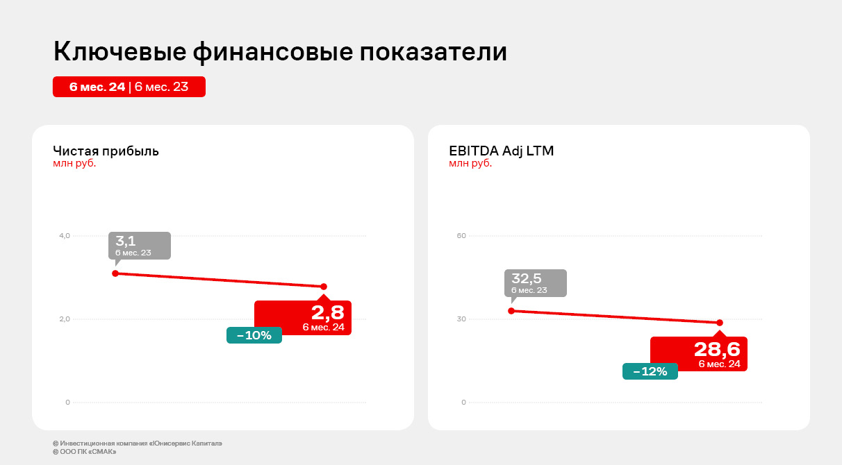 Эмитент прогнозирует восстановление объемов продаж в третьем квартале 2024 г. Для увеличения финансовых результатов «СМАК» ведет работу по расширению клиентского портфеля. В 1 полугодии были подписаны договоры с иркутской компанией «Слата» и с томской сетью SPAR. Первые отгрузки в ритейлеры запланированы на второе полугодие.
