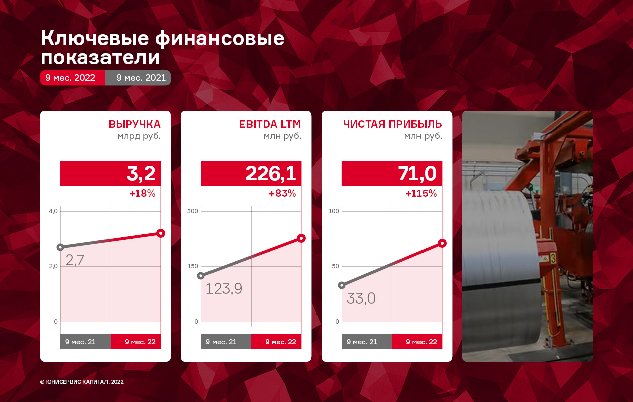 Эмитент подвел итоги работы за 9 месяцев 2022 года, которые вновь показали положительную динамику: потребление заводом металла в натуральном выражении выросло в среднем на 10%, выручка — на 18%, чистая прибыль — на 115% к АППГ.