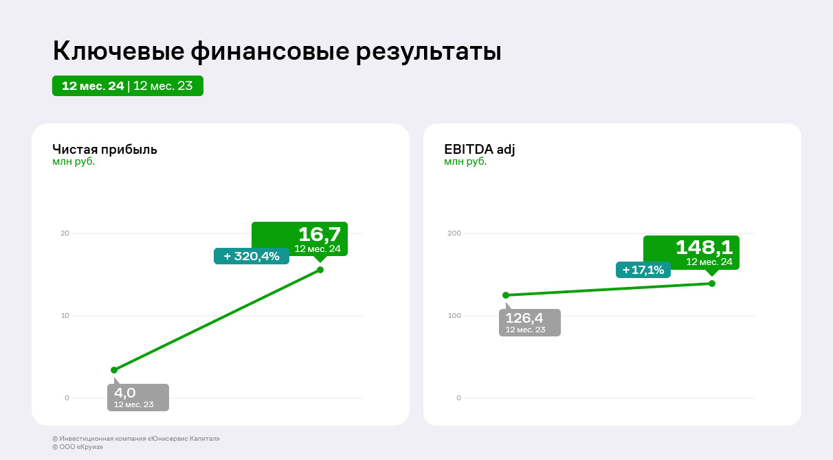 Подобная динамика показателя ранее уже отмечалась: в 2021-2022 г. рентабельность деятельности также составляла 0,1%, после чего возрастала до среднеотраслевых значений (2%) в 2024 г. Несмотря на снижение прибыльности в краткосрочной перспективе, в компании ожидают, что новая стратегия по масштабированию бизнеса в дальнейшем положительно повлияет на результаты ООО «Круиз». Рентабельность по EBITDA adj, рассчитываемая за последние 12 месяцев, также приросла (с 14 до 20%) соответственно динамике показателя.