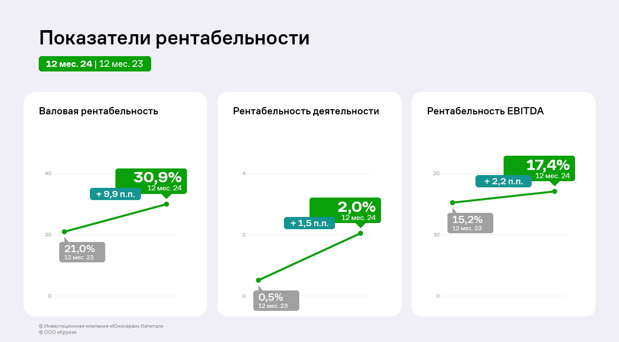 Вследствие этого все рассчитанные показатели рентабельности также увеличились: валовая рентабельность выросла на 10 процентных пунктов, рентабельность деятельности и EBITDA adj — на 1,5 и 2,2 п. п. соответственно.