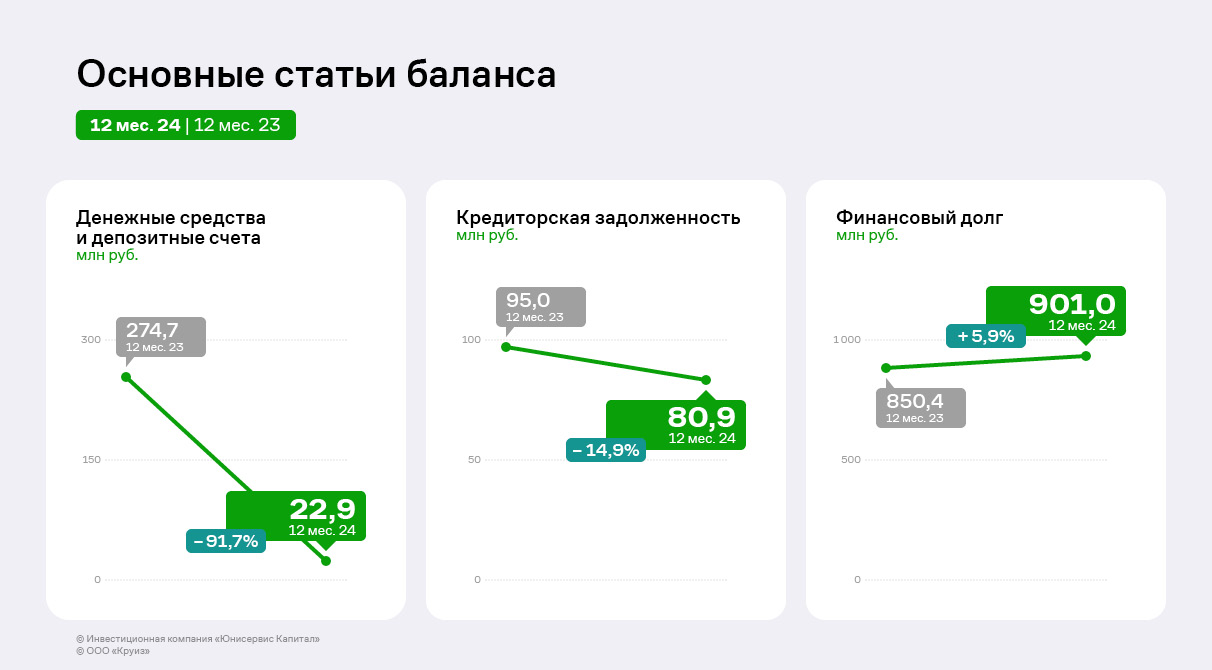 Долгосрочные финансовые вложения в сумме 182,8 млн руб. состоят из вкладов в уставные капиталы зависимых обществ, а также из долгосрочного займа, выданного ООО «Транс-Миссия» (владелец бренда «Таксовичкоф») с целью частичного финансирования сделки по приобретению активов сервиса «Ситимобил». Гарантией финансовым вложениям эмитента стала покупка ООО «Круиз» доли в размере 20% в уставном капитале ООО «Транс-Миссия». Общая сумма показателя за анализируемый период не изменилась. Также в 2024 г. был произведен возврат депозита в сумме 250 млн руб., что отразилось на снижении объема денежных средств и эквивалентов.
