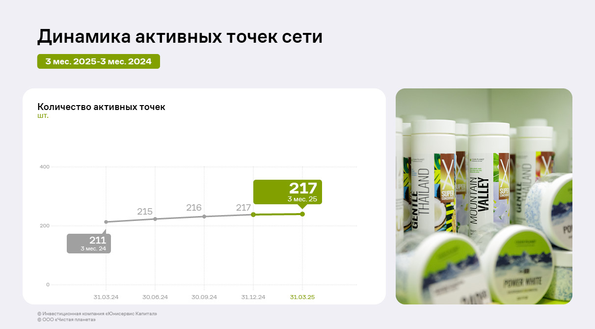 Основным каналом реализации продукции ООО «Чистая Планета» остаётся розничная сеть торговых точек, развивающаяся под брендом «Чистая Планета». По итогам 3 месяцев 2025 года она состоит из 217 магазинов: 15 их них — собственность эмитента, 202 точки работают по договору франчайзи, заключенному с компанией.