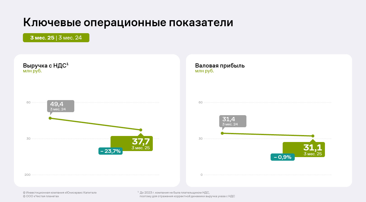 Выручка ООО «Чистая Планета» относительно 3 месяцев 2024 года снизилась на 23,7% ввиду перехода части клиентов от офлайн-шоппинга к маркетплейсам и онлайн-площадкам, что привело к оттоку клиентов и снижению объёмов продаж. Руководство «Чистой Планеты» пояснило, что к 1 кварталу 2025 г. уменьшилось число клиентов, с которыми были заключены договоры по реализации продукции под собственными торговыми марками заказчиков, также произошло сокращение продаж через франчайзинговую сеть на 40%.