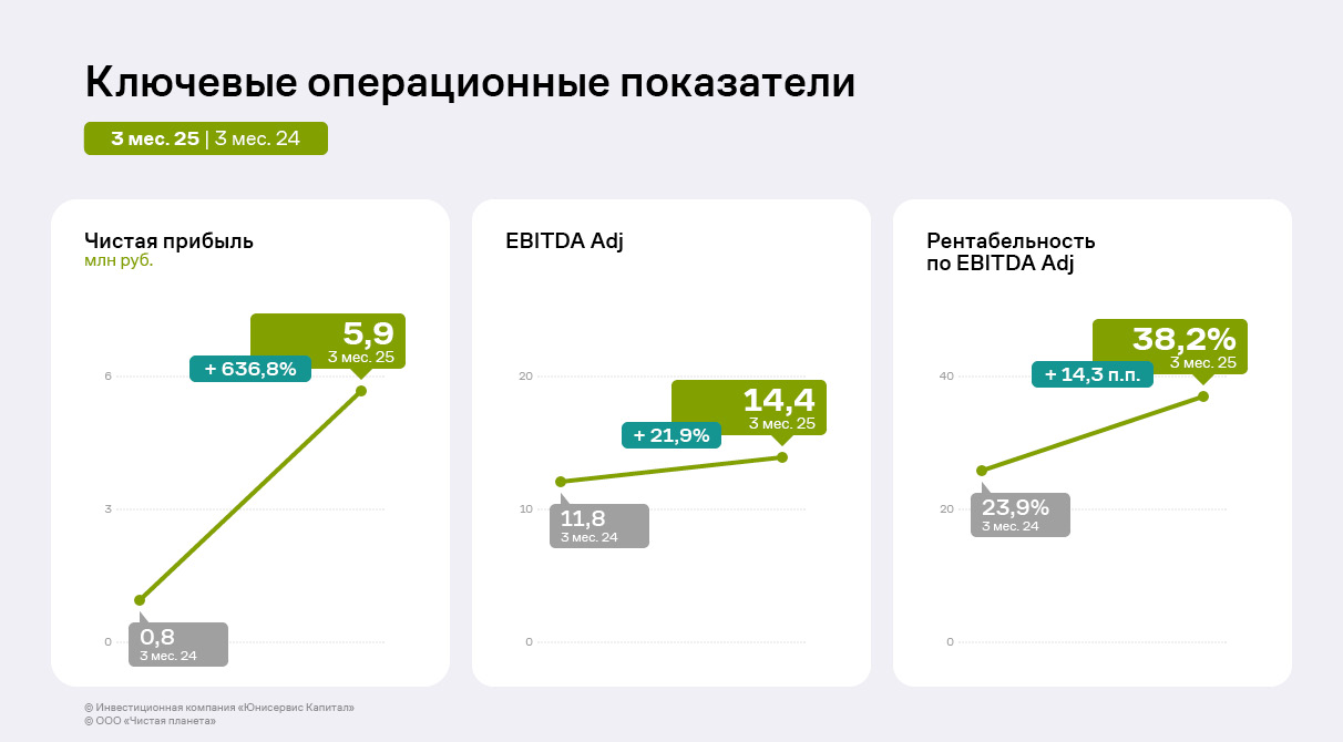 EBITDA Adj выросла по итогам 3 мес. 2025 г. на 21,9% до 14,4 млн руб. к АППГ. Вместе с этим существенно увеличилась и рентабельность по EBITDA Adj с 23,9% до 38,2%. В первую очередь, это связано со значительным сокращением коммерческих и управленческих расходов. По словам представителей компании, для сокращения расходов был проведён ряд мероприятий, в том числе, удалось снизить транспортные расходы (в 1 квартале уменьшилось число грузов, которое перевозил эмитент за свой счёт, часть партнёров взяла логистические траты на себя). Также сокращение коммерческих и управленческих расходов стало ключевым драйвером роста чистой прибыли ООО «Чистая Планета»: показатель вырос более чем в 7 раз к АППГ до 5,9 млн руб.