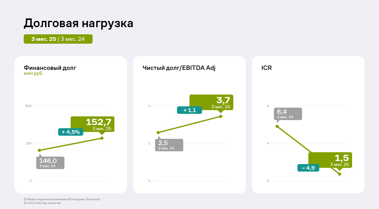 В 1 квартале 2025 г. ООО «Чистая Планета» получило денежные средства от одного из учредителей — ООО «Сибэксперт», которое с февраля 2025 года владеет долей в 99% уставного капитала компании. Заём был использован для проведения плановой безотзывной оферты, а также погашения кредиторской задолженности. Согласно комментариям руководства предприятия, средства от займа ООО «Сибэксперт» получены на 2 года по ставке — 21% годовых, погашение задолженности предусмотрено в конце срока, а выплата процентов происходит на ежемесячной основе.