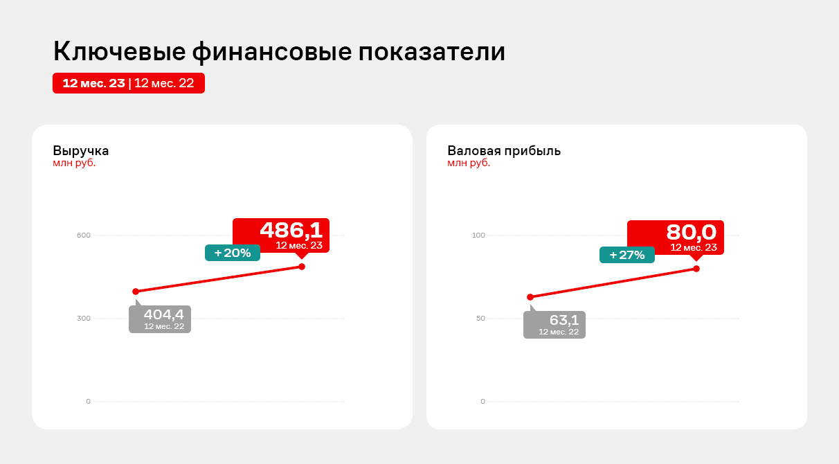 По итогам 2023 года эмитент смог увеличить объемы выручки на 20% к аналогичному периоду прошлого года до 486,1 млн руб. Прибыль от реализации, валовая прибыль и EBITDA adj также продемонстрировали рост более чем на 20%.