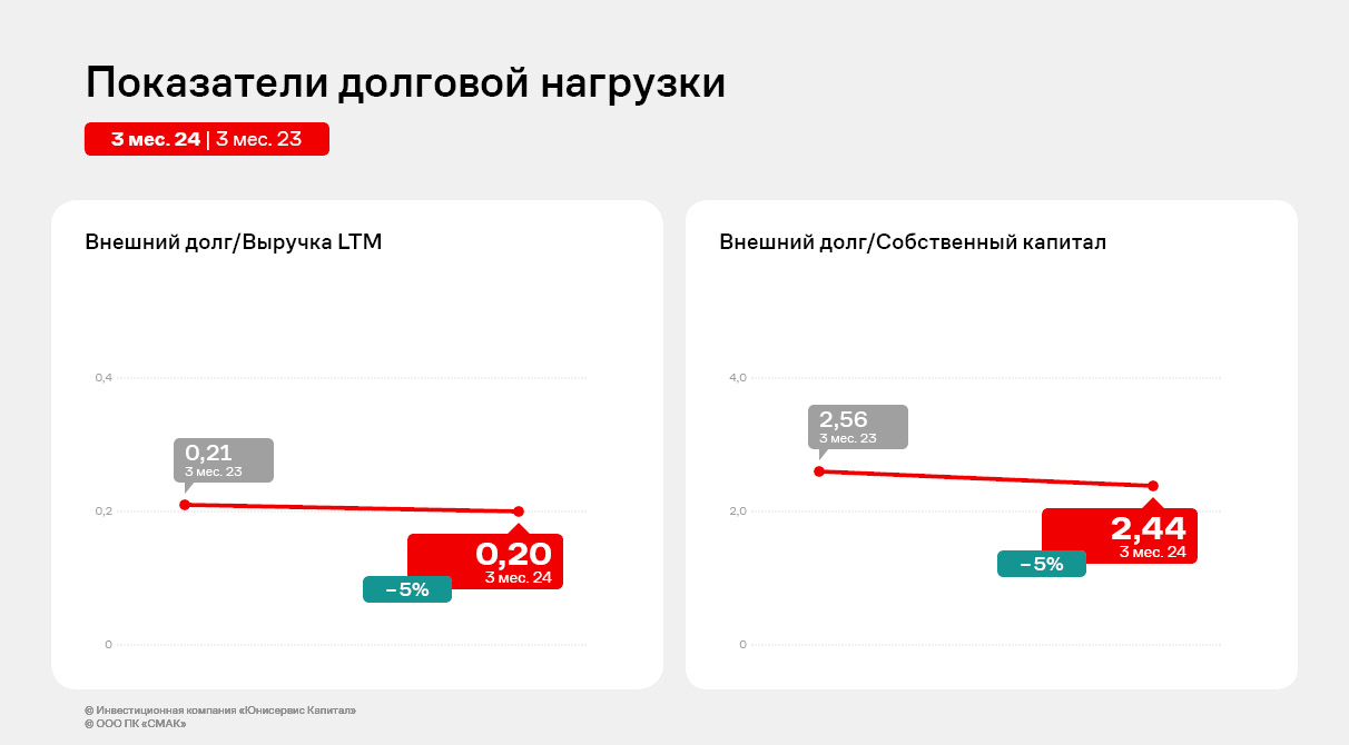Долговая нагрузка компании по-прежнему состоит из внешнего долга и долга перед собственником. На конец отчетного периода общая сумма задолженности составила 246,4 млн руб., увеличившись на 9,2% к АППГ за счет привлечения в 2023 году дополнительного финансирования, представленного в том числе облигационным займом серии СМАК-БО-П02.
