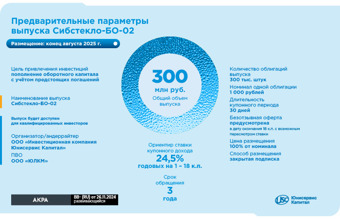 Согласно информации, которую ООО «Сибстекло» раскрыло на своей странице на сайте «Интерфакс», ставка купонного дохода по выпуску Сибстекло-БО-02 (№ 4B02-02-00373-R от 15.08.2025) установлена на уровне 24,5% годовых на 1 — 18 купонные периоды. После предусмотрена безотзывная оферта с возможным пересмотром ставки. Объём выпуска — 300 млн руб., номинал — 1 000 руб. Срок обращения составит 3 года с ежемесячной выплатой купонного дохода. Цена размещения — 100% от номинала.